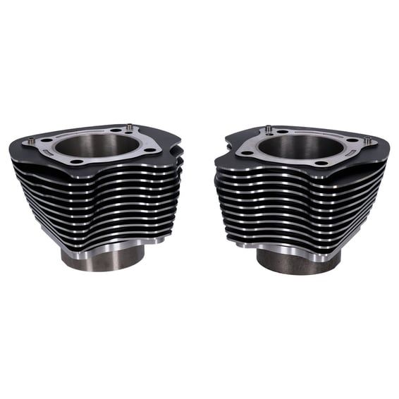 Black with highlighted fins. This is a quality 4.25" bolt-on big bore cylinder kit for 107" M8 models with stock 3.937" bore x 4.375" stroke. Kit can be used with a 4.25" Wiseco big bore piston & ring kit. Cylinders include dowel pins and are marked for correct front/rear installation. Capacity will increase from stock 107" (106.52" / 1746cc) to a hefty 124" (124.13 / 2034cc) but still installs without crankcase machining. Flywheel re-balancing is not required. Compression ratio is 1:11 and is compatible with the stock camshaft. Includes installation instructions. Note: Order 576555 Wiseco 4.25" bore conversion piston & ring kit & 576556 Wiseco gasket kit separately.