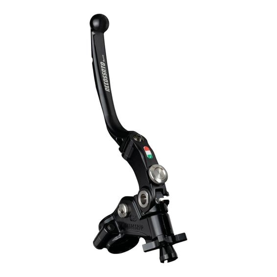 Black anodized lever assembly with a black anodized clutch lever and cable adjuster. Folding lever without RST (Racing Short), so not slotted for weight reduction. For 1" (25.4mm) diameter handlebars. The Accossato Racing cable clutch 'Racing' is a patented, one-of-a-kind component designed for high-performance riders. Featuring a unique "click" cable adjustment system and the exclusive ability to adjust the distance between the lever and the grip, this clutch offers unmatched customization. The folding lever is CNC-machined from anodized aluminum and available in multiple colors, with the cable adjuster matching the lever color. - Non adjustable 19mm distance for track/street use - Stainless steel hardware - Integrated micro switch - A mirror holder is separately available as 721082 for M8 or 721083 for M10 threaded mirrors - Does not include required clutch cable