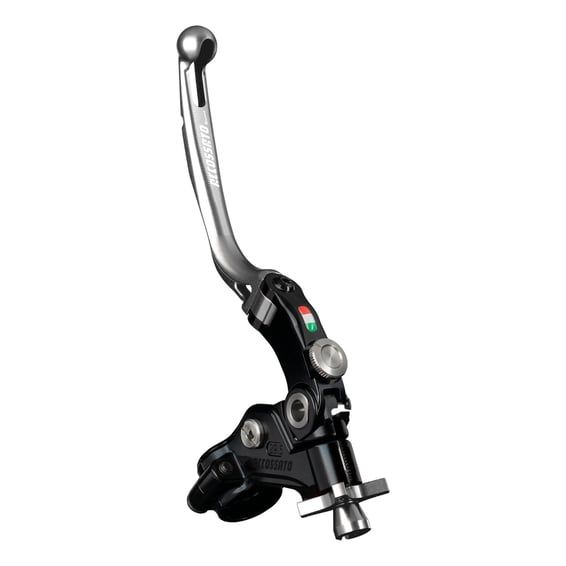 Black anodized lever assembly with a silver anodized clutch lever and cable adjuster. Folding lever comes with RST (Racing Short), so not slotted for weight reduction. For 1" (25.4mm) diameter handlebars. The Accossato Racing cable clutch 'Racing' is a patented, one-of-a-kind component designed for high-performance riders. Featuring a unique "click" cable adjustment system and the exclusive ability to adjust the distance between the lever and the grip, this clutch offers unmatched customization. The folding lever is CNC-machined from anodized aluminum and available in multiple colors, with the cable adjuster matching the lever color. - Non adjustable 19mm distance for track/street use - Stainless steel hardware - Integrated micro switch - A mirror holder is separately available as 721082 for M8 or 721083 for M10 threaded mirrors - Does not include required clutch cable