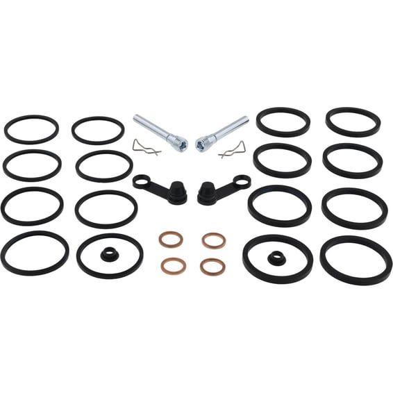 Kit for rebuild service of two front brake calipers. (Kit without pistons). - Improves brake feel and restores lost brake performance, with a proper brake bleed - Decreases risk of seized or leaking brake caliper pistons - Gives new life to the caliper by replacing deteriorated rubber parts - Includes as applicable: boots, seals, bleeder cap, brake pad retaining pins and copper washers