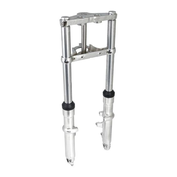 Polished aluminum lower fork sliders. Dual disc. Complete with a chrome triple tree set and include 41mm fork tubes, lower sliders, hard chromed fork tubes complete with all internal components and fork plugs. Ready to install. Takes stock type disc brake calipers. Made as an OEM style replacement, but don't let that stop you from using them in custom applications.