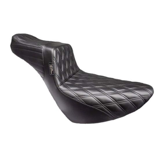 11" wide rider seat area with 6.5" of back support. 7.25" wide passenger seat area. Double Diamond stitch pattern. The whipped tail improves passenger lower back support. That, combined with the unrivalled 6.5" high arching back support for the rider, makes the Tailwhip a serious in contender when it comes to a great mix of style and comfort. This 'Daddy Long Legs' version comes with the seating area positioned 2 inches (51mm) further backward to accommodate the longer legs of taller riders. Built with LePera's high-density marathon foam filling on a 16-gauge black powder coated steel baseplate for long lasting excellence.