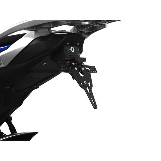 Black powder coated license plate bracket that allows installation without making changes to the fairing parts. Use with 175mm wide license plate (Germany, France, Italy). Including LED license plate light (ECE approved)