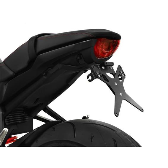 Black powder coated license plate bracket that allows installation without making changes to the fairing parts. Use with 175mm wide license plate (Germany, France, Italy). Including LED license plate light (ECE approved)