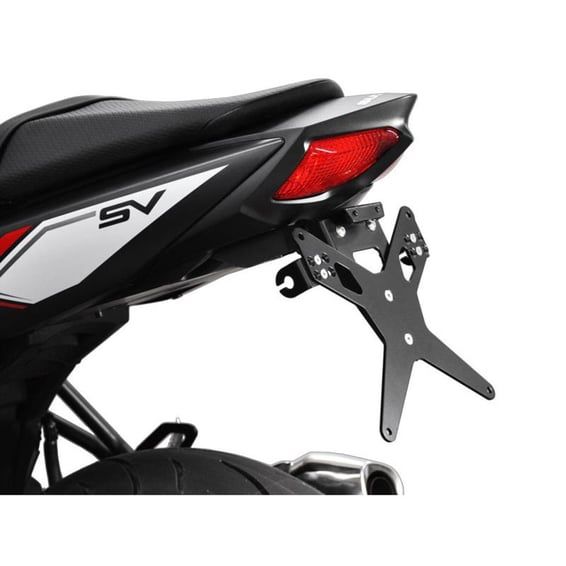 Black powder coated license plate bracket that allows installation without making changes to the fairing parts. Use with 175mm wide license plate (Germany, France, Italy). Including LED license plate light (ECE approved)