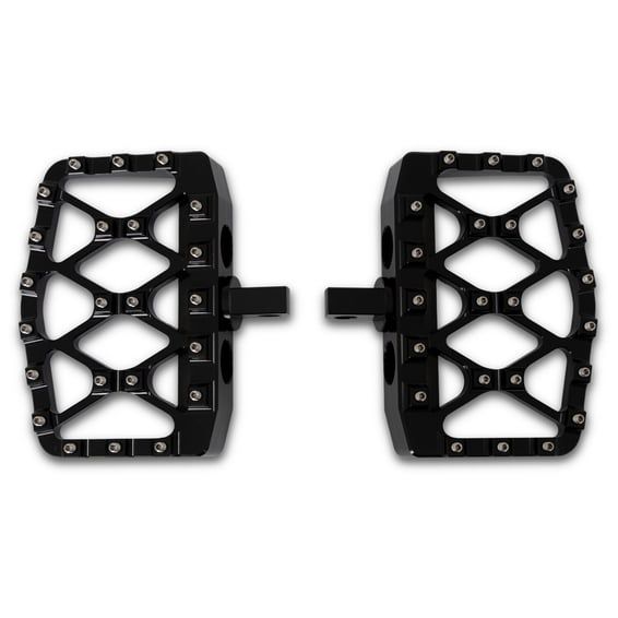 Satin black powder coated lightweight aluminum alloy floorboards. CNC machined, proudly showing the Burly brand laser engraved logo. The serrated surface, with no-slip set screws, offers a bite that makes these boards offer unsurpassed grip for easy-riding in any standard to extreme situation.