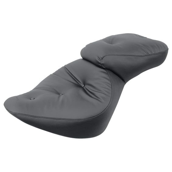 Black. Front width 17.5", rear width 14". A classic pillow seat, hand-tied buttons and extra padding for the true upholstered pillow top look. Comes with a low cut riders area to give great lower back support. The squared off passenger seat area enables the largest seating surface for the given width. The seat is built on a one-piece marine-grade fiberglass baseplate.