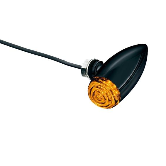 Gloss black housing. Universal 1-1/4" (3.18cm) diameter x 3" (7.6cm) long Mini Bullets. Can be used as marker light or as auxiliary turn signals. Their intensity greatly exceeds the small size. With amber LEDs. The power lead exits the light through the center of the hollow 3/8"-16 x 5/8" mounting bolt. This provides a very clean installation. Note: A load equalizer, which may be required depending on the bike, is not included.
