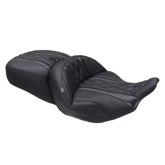 Engineered for long-haul comfort, with a classic black Deluxe Diamond stitch pattern. The front seat places the rider in a position similar to stock but sets you back 1/2" (12.7mm) with an ergonomic angle for improved touring posture and enhanced comfort. With a generous 18.5" width, it delivers all-day support for even the longest rides. The 13.5"-wide rear seat keeps your passenger fully supported and secure. The built-in receiver accommodates an optional, removable, and fully adjustable driver backrest, optionally available as 709296. Note: See 709296 for the optional rider backrest that fits the built-in receiver.