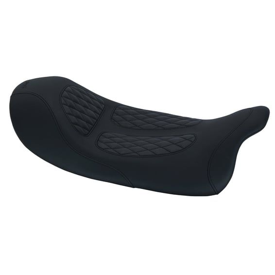 Black. 10.5" wide, narrower than any stock seat. Black Diamond stitched inlays. Signature Series is designed by Dave Perewitz. These are in a class of their own. The Signature Series is designed by Dave Perewitz, a name that first entered the Harley-Davidson chopper & custom scene over 40 years ago, and since then became iconic. The Perewitz seat build quality is outstanding, simply since it's is built to regular Mustang seat standards. All come with a hidden mounting system, without any visible bolts or mounting brackets. Ready for years of service and... designed by a true King of Customizing! Note 1: Not compatible with OEM or Mustang passenger seats. Note 2: A matching Fender Bib, by Perewitz, is separately available as 537531 for the next level in a subzero cool factor.