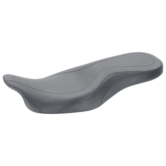 Black. Front 14" wide & rear 11" wide. Detailed stitch work in a highly durable synthetic glove-leather cover. Nicely flowing low profile contours blend into the lines of the bike that makes you wonder if maybe the bike was designed after the seat. Shorter rider will value the low seating height for its functionality, taller riders will value it for its low profile.