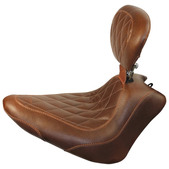 Distressed brown. 13" wide. Diamond style stitch. With adjustable rider backrest. The backrest is easily removed when not required.